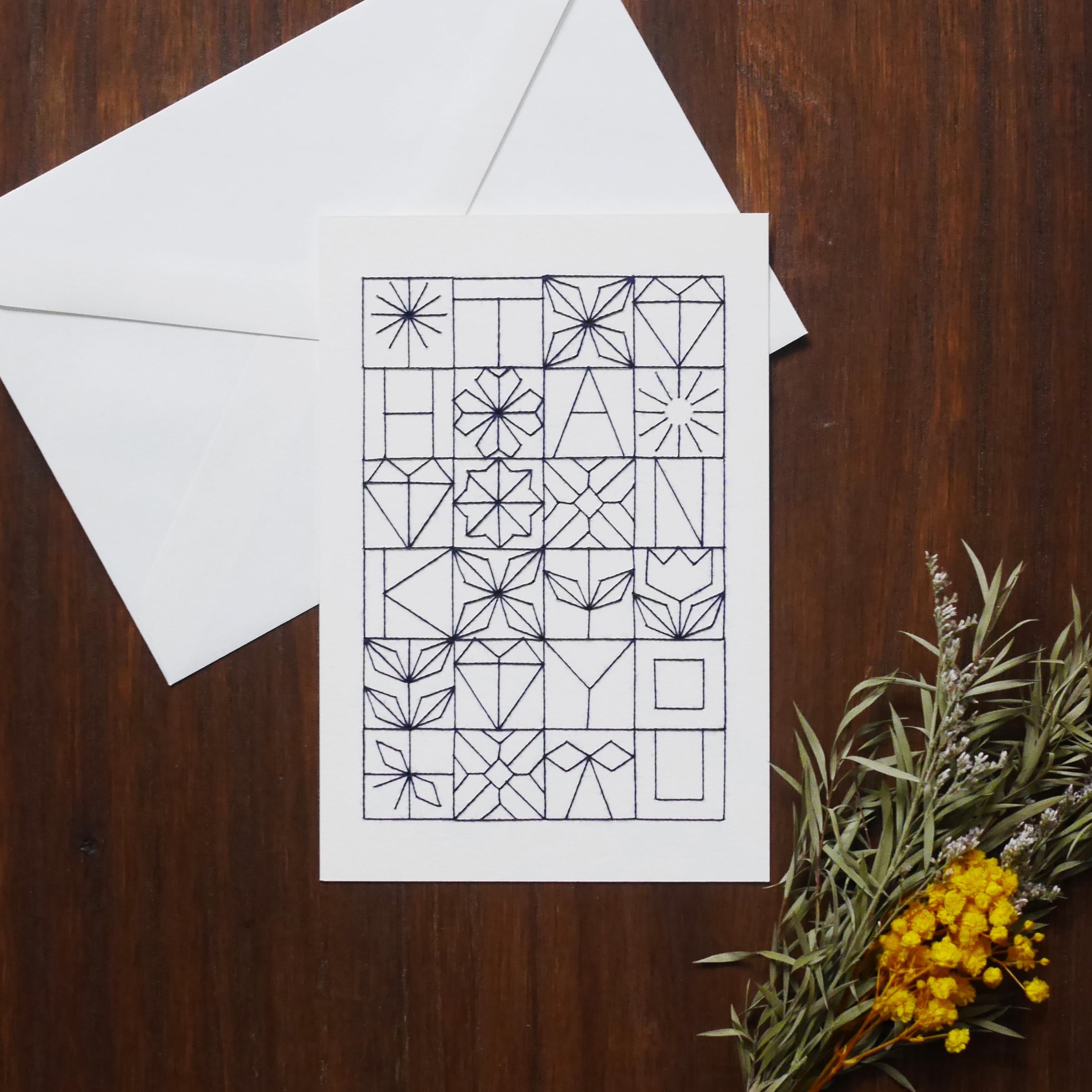 4. 刺し終わったらカードの裏面にスプレーのりを塗布し、上にもう一枚のカードをぴったり重ねて完成です。