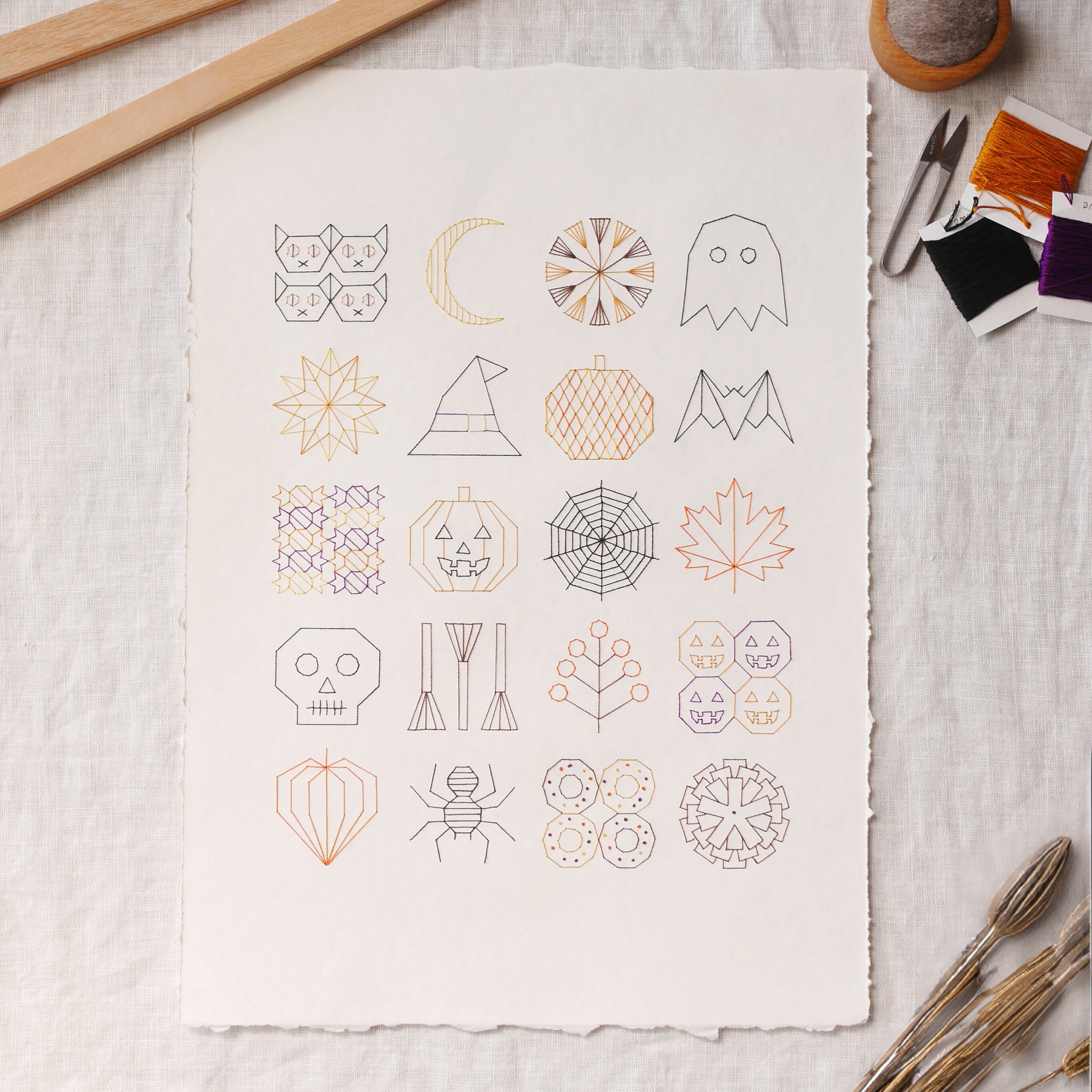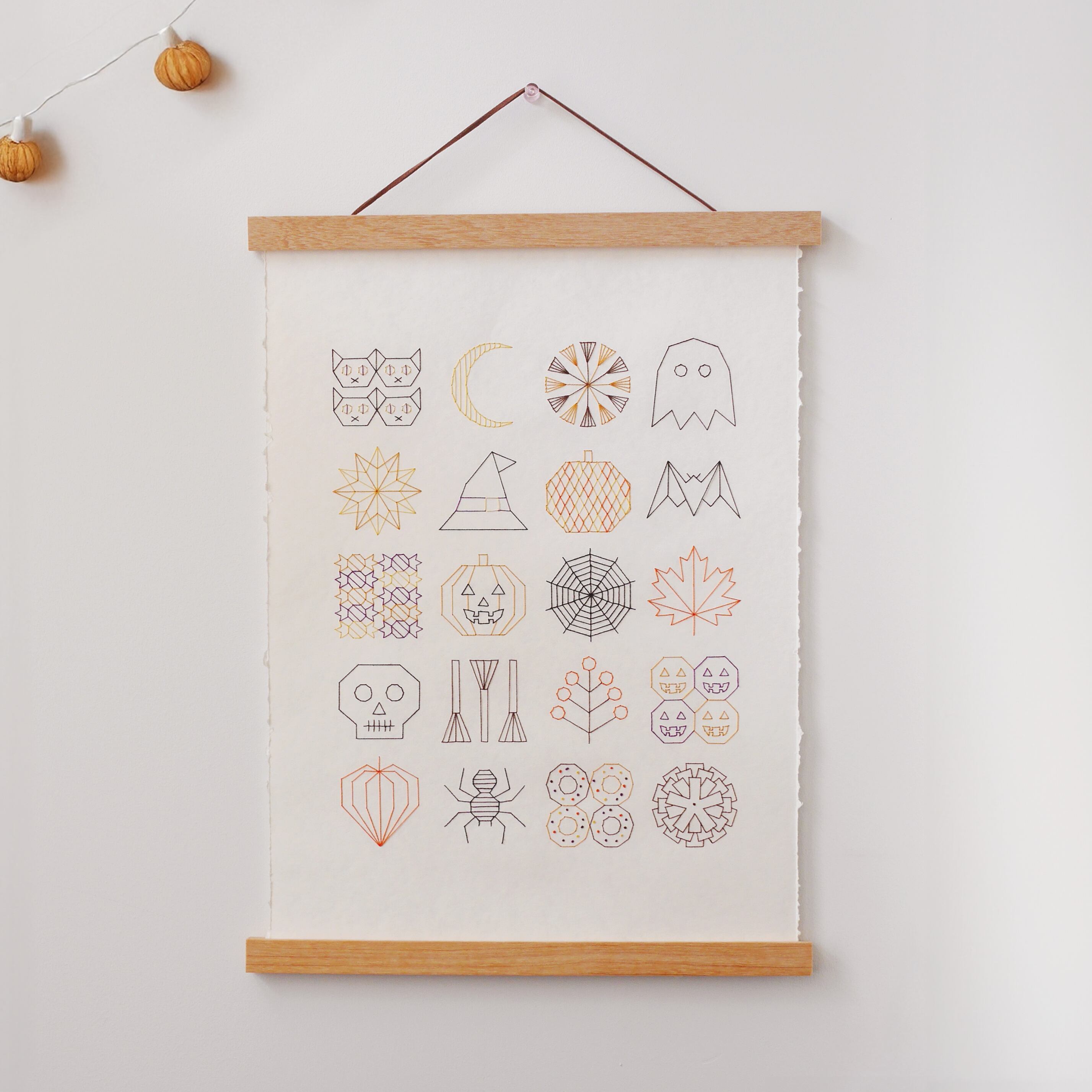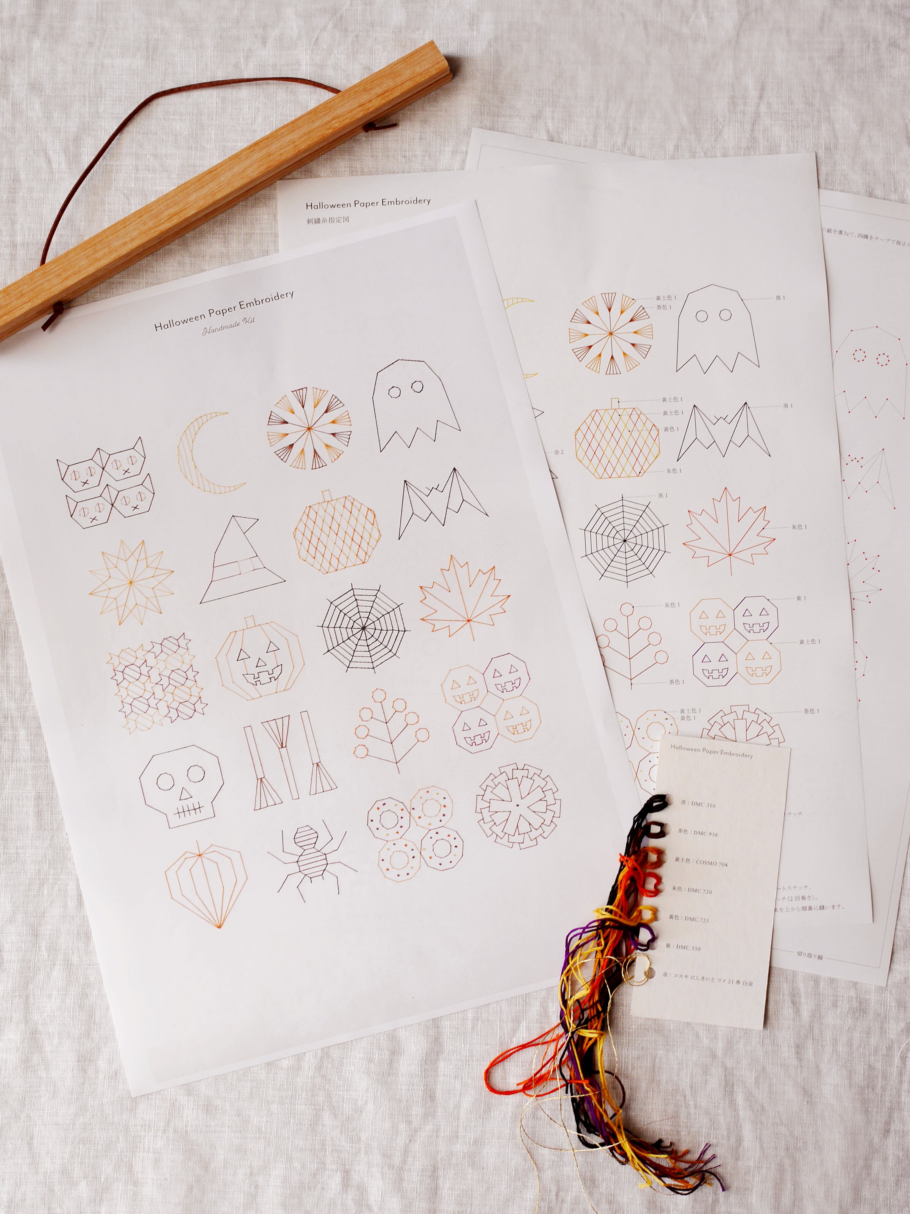 ジャックオーランタン、蜘蛛の巣、黒猫、魔女の帽子やほうきなどこの季節ならではのモチーフが並んだ華やかで繊細な紙のタペストリーができます。