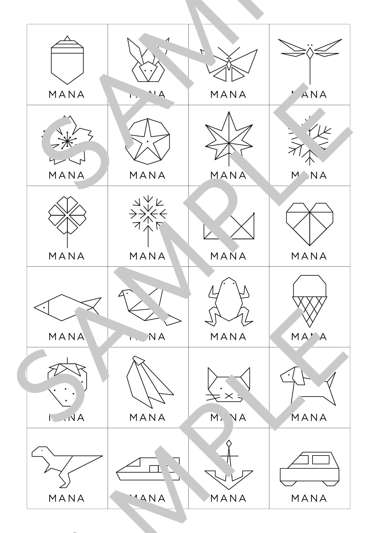 どんぐり、うさぎ、ちょうちょ、トンボ、桜、朝顔、紅葉、雪の結晶、クローバー、綿毛、かんむり、ハート、さかな、とり、カエル、アイスクリーム、いちご、バナナ、ねこ、いぬ、恐竜、新幹線、碇、くるま